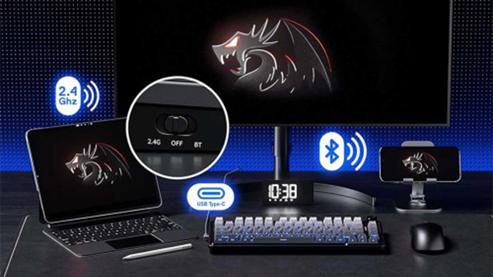 تکنولوژی بدون سیم در سالهای اخیر پیشرفت زیادی کرده و حالا کیبورد بی سیم ردراگون با کمترین تاخیر ممکن (Latancy) عرضه میشه. این محصولات معمولاً از سه نوع اتصال (بلوتوث، دانگل 2.4G و کابل) پشتیبانی میکنن تا شما بتونین همزمان به چند دستگاه وصل بشین و میزی کاملاً تمیز و بدون سیمهای اضافه داشته باشین.