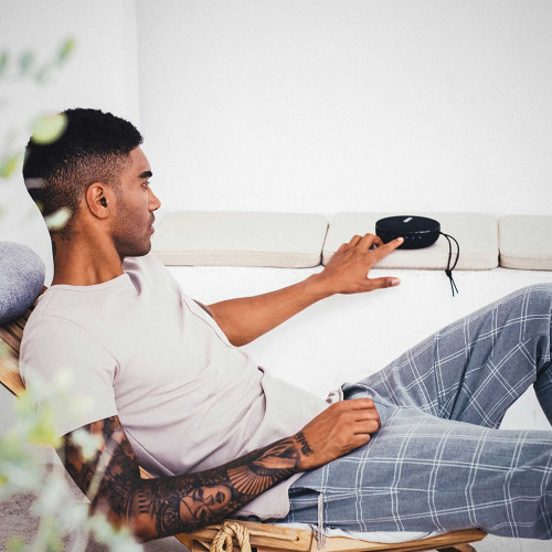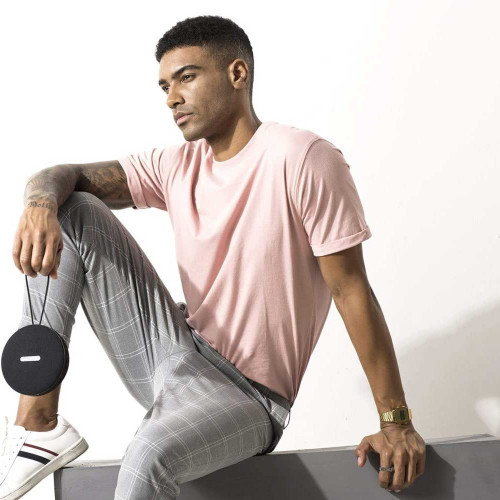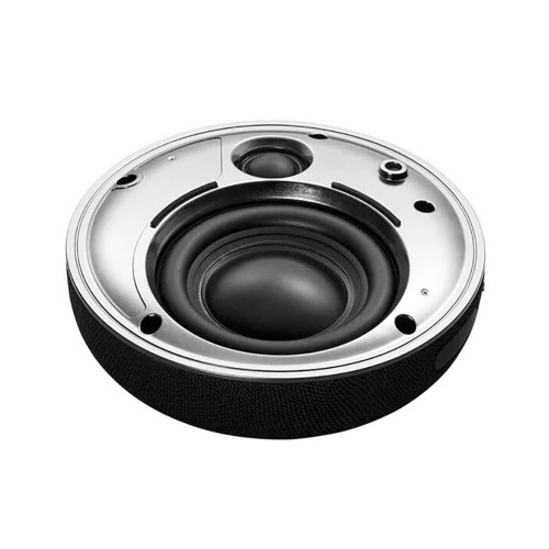 این اسپیکر پرتابل حدود 500 گرم وزن داره و ابعادش 137 در 137 در 57 میلیمتره؛ یعنی به اندازهای جمعوجوره که حملش سخت نباشه، اما همچنان قدرت صدای بالایی ارائه بده. بدنه از ترکیب پارچه ضدآب و حلقه فلزی ساخته شده که علاوه بر زیبایی، مقاومت خوبی در برابر پاشش آب و تعریق داره. طراحی کاسهای شکل اسپیکر باعث میشه صدا به شکل پخششدهتری منتشر بشه. اسپیکر شامل یک ووفر 85 میلیمتری و یک توییتر 27 میلیمتری هست که تفکیک صدا رو بهخوبی انجام میدن. دکمههای مکانیکی روی بدنه برای کنترل پخش، صدا و تماسها در نظر گرفته شدن.