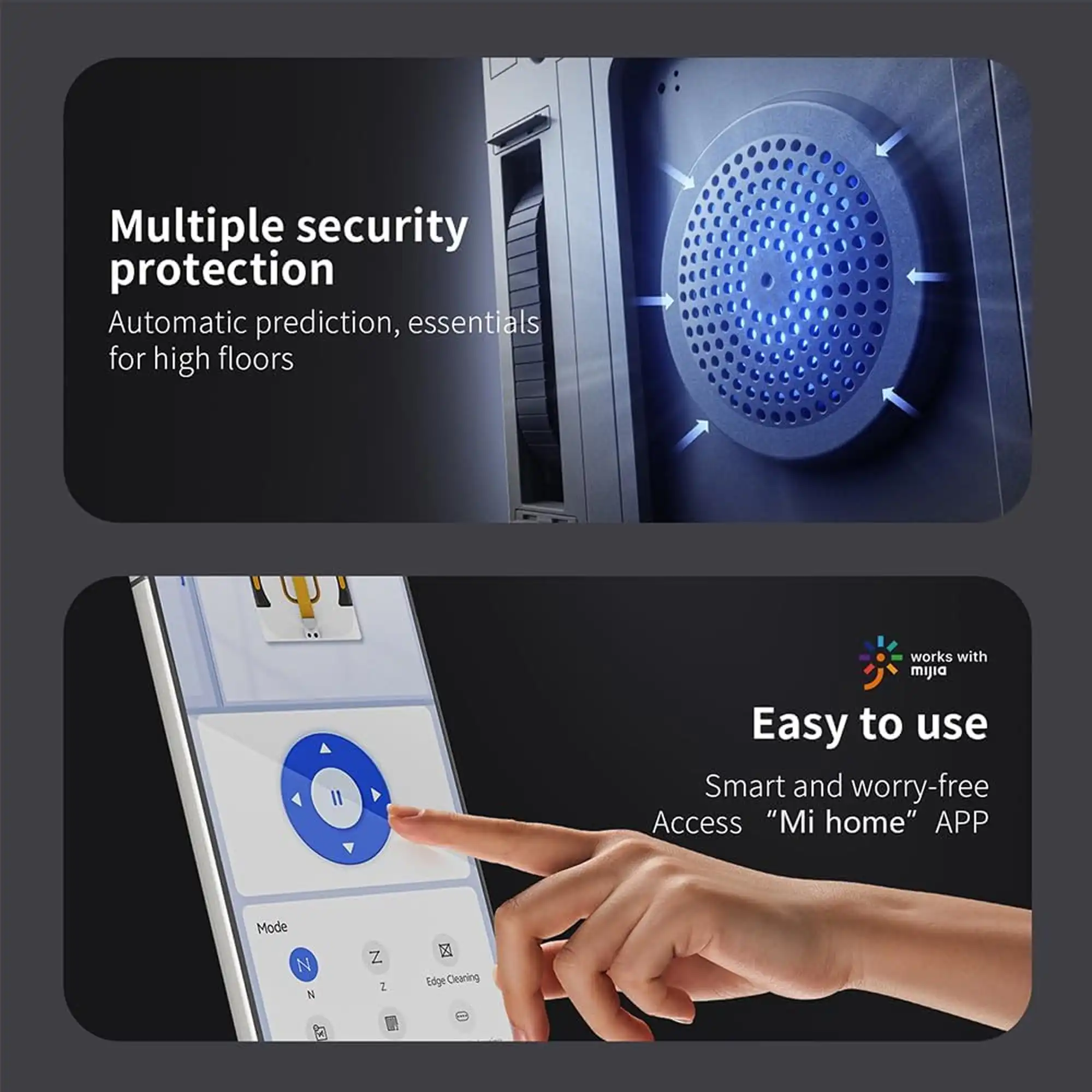 | سایر ویژگی ها | اسپری اولتراسونیک دارای دو نازل – مهپاشی برای لکهزدایی عمیق | مناسب انواع پنجرهها، شیشههای بدون قاب، سطوح شیشهای بزرگ | الگوی حرکت مسیر تطبیقی N/Z – پوشش کامل بدون جاافتادگی | سیستم ایمنی کابل ضد سقوط + UPS داخلی – محافظت در شرایط اضطراری | جنس پارچه تمیزکننده فیبر با اصطکاک بالا – قابل شستوشو و بادوام | دارای سنسورهای هوشمند تشخیص لبه، موانع، دستگیرهها و سطوح ناهموار |