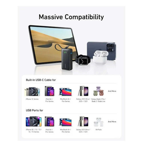 پاوربانک انکر A1259 یه کابل داره که به خود این محصول متصله. همچنین دو درگاه (یکی از نوع تایپ سی و یکی USB) هم روی اون تعبیه شدن. بنابراین، برای وصل کردن دستگاههای مورد نظرتون به این پاوربانک، امکان استفاده از هر سه درگاه رو دارین. درواقع این محصول قابلیت شارژ کردن همزمان 3 دستگاه مختلف رو داره. اما برای شارژ کردن خود پاوربانک باید از درگاه تایپ سی استفاده کنین؛ درنتیجه هم میتونین کابل اون رو به آداپتور وصل کنین و هم یه کابل جداگونه رو از طریق پورت تایپ سی بهش وصل کنین تا انرژی باتری اون تامین بشه.