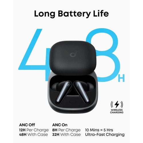 در حالت ANC فعال، حدود 8 ساعت با ایرباد و 32 ساعت با باکس شارژ. در حالت غیر فعال، تا 12 ساعت با ایرباد و 48 ساعت با باکس شارژ شارژدهی داره.