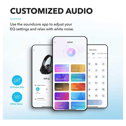 هدفون بی سیم انکر Anker SOUNDCORE Q20I) A3004H31) قابلیتهای ویژهای داره که اون رو کمی حرفهایتر کرده. برای مثال وجود تکنولوژی Hybrid Active Noise Canceling باعث شفافیت بیشتر صدای این هدفون میشه؛ یا میتونین اکولایزر اون رو شخصیسازی کنین. همه این امکانات با استفاده از برنامهsoundcore قابل استفاده هستن که داخل گوشی نصب میشه. یه مزیت دیگه برای هدفون q20i هم قابلیت نویز کنسلینگ و امکان اتصال اون به دو دستگاه بهطور همزمانه.