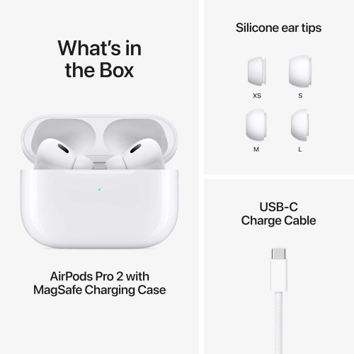 توی جعبه هدفون بیسیم اپل مدل Air Pods Pro 2 USB-C، یه کابل Type-C برای شارژ، باکس شارژ و سه جفت سری سیلیکونی نرم با اندازههای کوچک، متوسط و بزرگ قرار گرفتن که میتونین اونها رو با توجه به سایز گوش خودتون انتخاب کنین. این مدل یه محصول عالی و کامل برای همه محسوب میشه که قیمتش نسبت به بقیه تولیدات اپل مناسبتره.