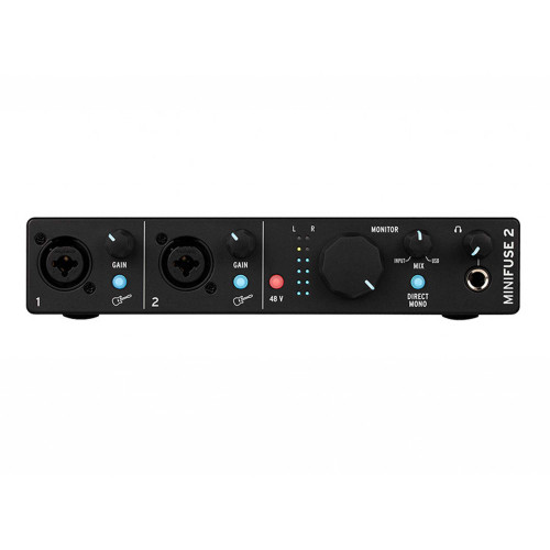 کارت صدا MiniFuse 2 از طریق رابط USB-C به سیستم متصل میشه و تغذیه خودش رو از همین طریق دریافت میکنه، بنابراین نیازی به منبع تغذیه خارجی نداره. این کارت صدا دارای 2 ورودی آنالوگ XLR/TRS ترکیبی برای اتصال میکروفون و ساز، و 2 خروجی 1/4 اینچی برای اتصال به اسپیکرها و سایر تجهیزات صوتی هست. کیفیت ضبط تا 24 بیت و 192 کیلوهرتز امکان ضبط صدایی شفاف و دقیق رو فراهم میکنه. MiniFuse 2 دارای فانتوم پاور 48V برای میکروفونهای کندانسور و همچنین قابلیت Loopback برای ضبط و پخش زنده صدا از ورودیها و کامپیوتره. علاوه بر این، این دستگاه دارای ورودی و خروجی MIDI هست که امکان اتصال به تجهیزات MIDI رو فراهم میکنه.