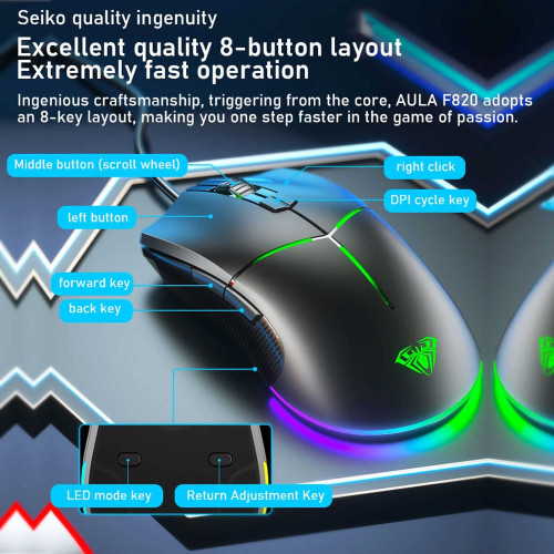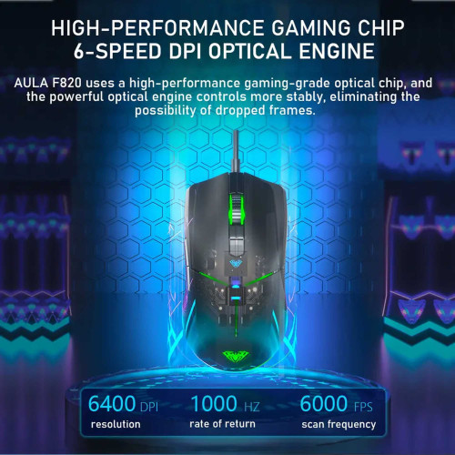 ماوس سیمی F820 آئولا، نور پس زمینه RGB داره و شما میتونین بسته به نیاز خودتون میزان DPI ماوس رو در دامنهاش تغییر بدین. یادتون باشه که این ماوس در مقابل آب مقاومتی نداره، اما با گردوغبار، مشکلی براش به وجود نمیاد.