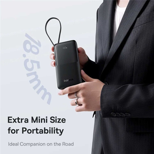 پاوربانک باسئوس Bipow 2 طراحی خوشدست و جمعوجوری داره. با ابعاد حدود 150 در 72 میلیمتر و ضخامت 34 میلیمتر، خیلی راحت توی کیف یا حتی جیب جا میگیره. وزنش هم حدود 340 گرمه که نسبت به ظرفیتش، مناسب به نظر میرسه. بدنهاش از جنس پلاستیک مقاوم ABS ساخته شده و یه نشانگر LED کوچیک هم روی بدنه قرار داره تا میزان شارژ باقیمونده رو بهتون نشون بده.