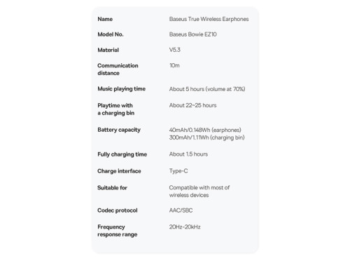 مشخصات فنی Wireless Earbuds Baseus Bowie EZ10