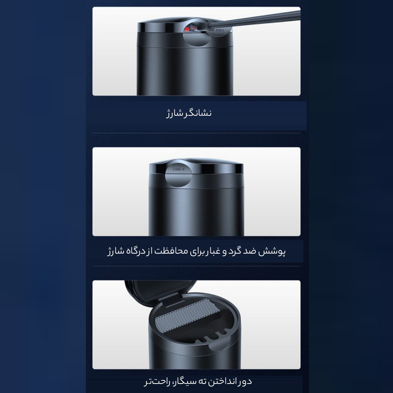 - 3 شیار برای قرارگیری سیگار با سایزهای مختلف