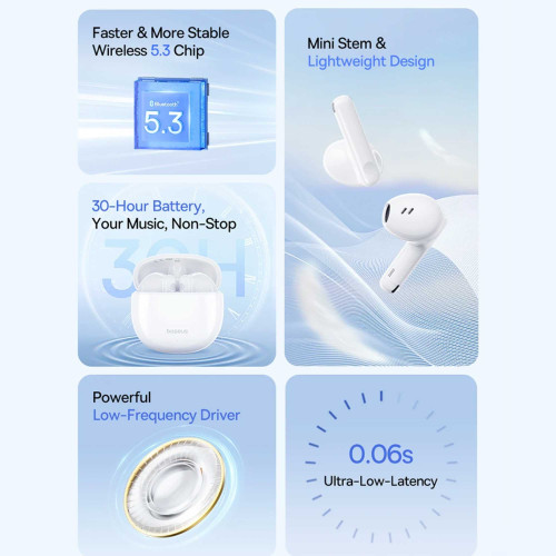 طراحی ظاهری این ایرپاد نشون میده باسئوس دقت زیادی روی راحتی کاربر گذاشته. وزن کیس شارژ این محصول فقط ۳۶.۱ گرمه که خیلی سبک به حساب میاد. خود ایرپادها هم با ابعاد 17.75 در 31.21 میلیمتر طراحی شدن تا کاملاً در گوش فیت بشن و نیفتن، حتی اگه در حال حرکت باشین. کیس شارژ با اندازه 50 در 51 در 26.5 میلیمتر هم خیلی جمعوجوره و بهراحتی تو جیب یا کیف جا میگیره. طراحی پشت بسته (Closed-back) باعث میشه صدای بیرون تا حد زیادی حذف بشه و تمرکز روی صدا بیشتر بشه.
