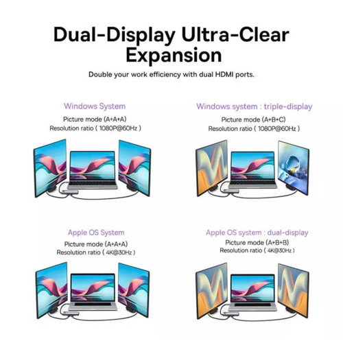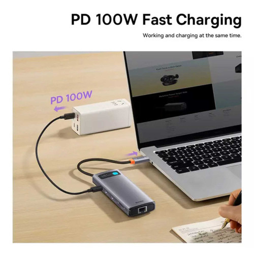 هاب باسئوس مدل WKWG060013 دارای 9 پورت ورودی متنوع شامل دو پورت HDMI، یک پورت TF، یک پورت SD، دو پورت USB 3.0، یک پورت Ethernet، یک پورت USB 2.0 و یک پورت Type-C هست که به شما امکان میده تقریباً هر نوع دستگاهی رو به اون متصل کنید. کانکتور خروجی این هاب از نوع Type-C (نری) هست و با دستگاههایی که پورت Type-C دارند، سازگاره. این هاب توان خروجی 100 وات داره که برای شارژ سریع و استفاده همزمان از دستگاههای مختلف ایدهآله. همچنین، پشتیبانی از کیفیت تصویر 4K و سرعت انتقال اطلاعات تا 500 مگابیت بر ثانیه (و 104 MB/s برای کارتهای SD/TF) این هاب رو به یکی از بهترین گزینهها برای افرادی که به سرعت و کیفیت اهمیت میدن، تبدیل میکنه.