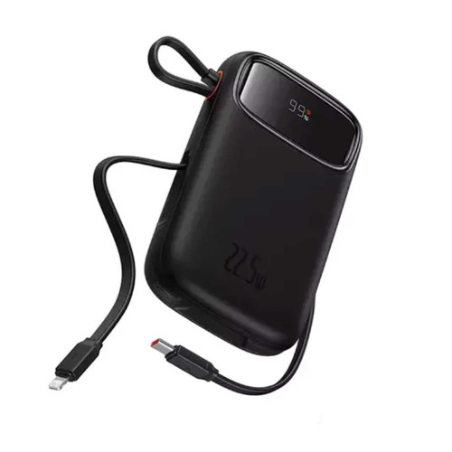 همونطور که توی تصویر هم میبینین، یه صفحه نمایش روی بدنه این پاوربانک قرار گرفته که میزان باتری اون رو نشون میده. کنارههای این شارژر همراه هم دو کابل رو میبینیم که بهش متصل هستن و داخل شیاری که در زیر محصول قرار گرفته، جای میگیرن. یکی از سیمها، رابط تایپ سی و دیگری از نوع لایتنینگه.