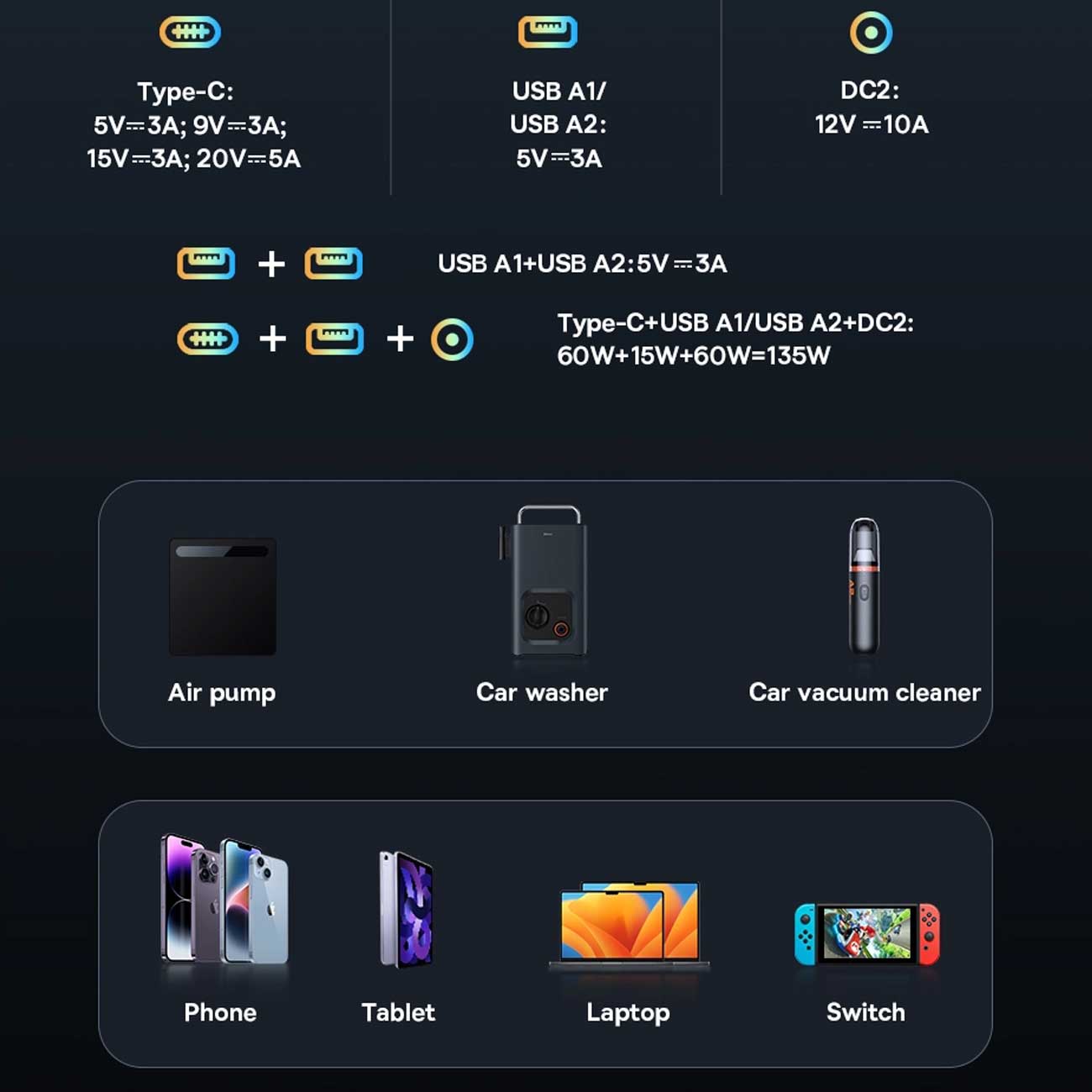 | توان خروجی | کل خروجی: Type-C+USB 1/USBA2+DC2: 60W+15W+60W = 135W، Type-C+USBA1+USBA2: 5V-6A |