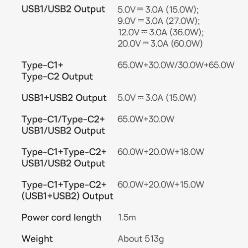 | خروجی Type-C1+Type-C2+(USB1+USB2) | 60.0W+20.0W+15.0W |