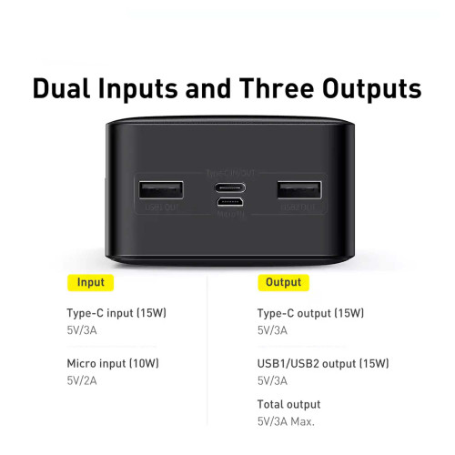 این پاور بانک دارای دو درگاه ورودی که یکی از اونا پورت Micro USB و دیگری پورت Type-C هستش. همچنین دارای سه درگاه خروجی هستش که یکی از اونا از پورت Type-C و دو درگاه دیگه از نوع USB A هستند. شدت جریان و ولتاژ ورودی برای درگاه USB Type-C به ترتیب 5 ولت/3 آمپر و 9 ولت/2 آمپر و برای درگاه Micro-USB به ترتیب 5 ولت/2 آمپر و 9 ولت/2 آمپر هست. همچنین شدت جریان و ولتاژ خروجی برای درگاه USB Type-C به ترتیب 5 ولت/3 آمپر، 9 ولت/2.22 آمپر و 12 ولت/1.5 آمپر و برای درگاههای USB Type-A به ترتیب 5 ولت/3 آمپر، 9 ولت/2 آمپر و 12 ولت/1.5 آمپر میباشد. همچنین این پاور بانک همراه یک عدد کابل Micro USB با قابلیت شارژ سریع عرضه میشه. یکی دیگه از ویژگیهای این پاوربانک مدیریت هوشمند شارژ، شارژ ایمن از نوع MultiProtect، محافظت در برابر اتصال کوتاه، شارژ بیش از حد، افزایش ولتاژ، جریان و دما هستش.