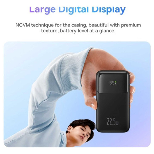 روی قسمت رویی پاوربانک PPMD020001 یه صفحه نمایش LCD دیده میشه که نشون میده میزان شارژ باتری اون چقدره. این محصول همراه با یه کابل تایپ سی به USB دو سر در اختیارتون قرار میگیره؛ درنتیجه برای شارژ کردن نیازی به سیم اضافه ندارین.
