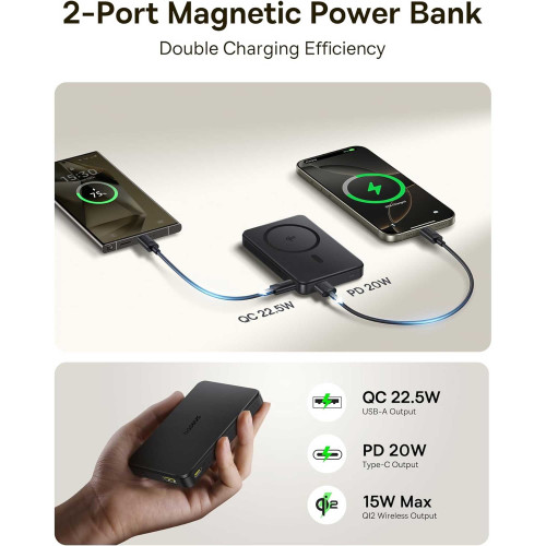 این مدل از یه باتری با ظرفیت اسمی 10000 میلیآمپر ساعت استفاده میکنه، که البته ظرفیت واقعی اون بسته به بازدهی بین 7400 تا 8000 میلیآمپر ساعته. برای شارژ دستگاهها، 2 درگاه خروجی (USB و Type-C) داره و همچنین از شارژ وایرلس با توان 15 وات پشتیبانی میکنه. نوع درگاه ورودی هم Type-C هست که سرعت بالایی در شارژ پاوربانک داره.