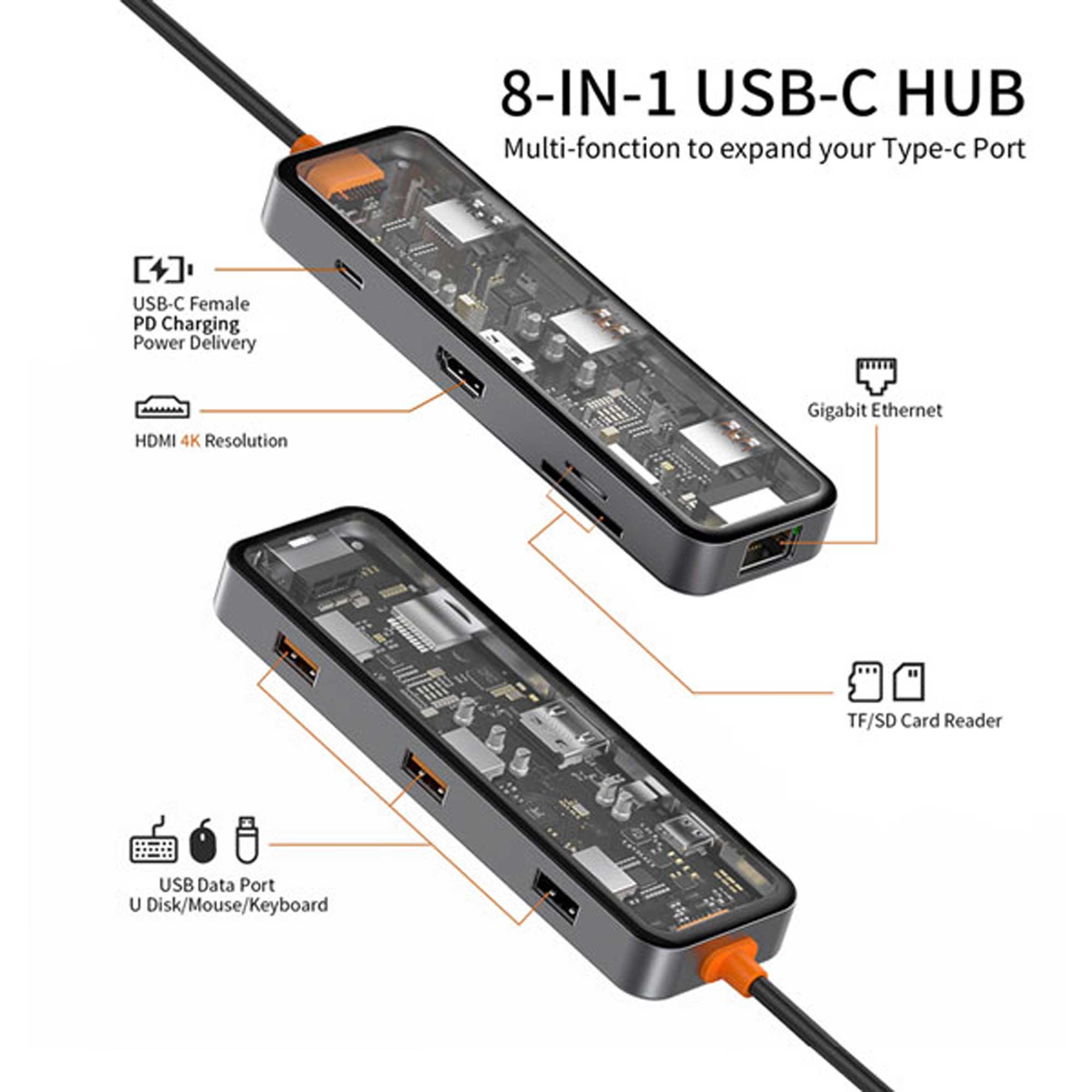 - دارای 8 پورت (HDMI + RJ45 (LAN) + Micro SD + SD + USB3.0 ×2 + USB2.0 + Type C PD )