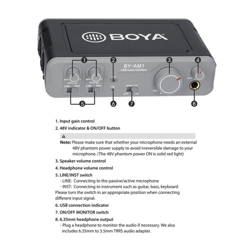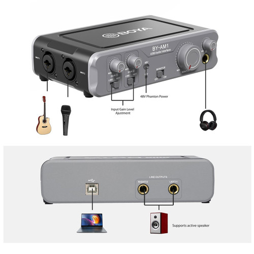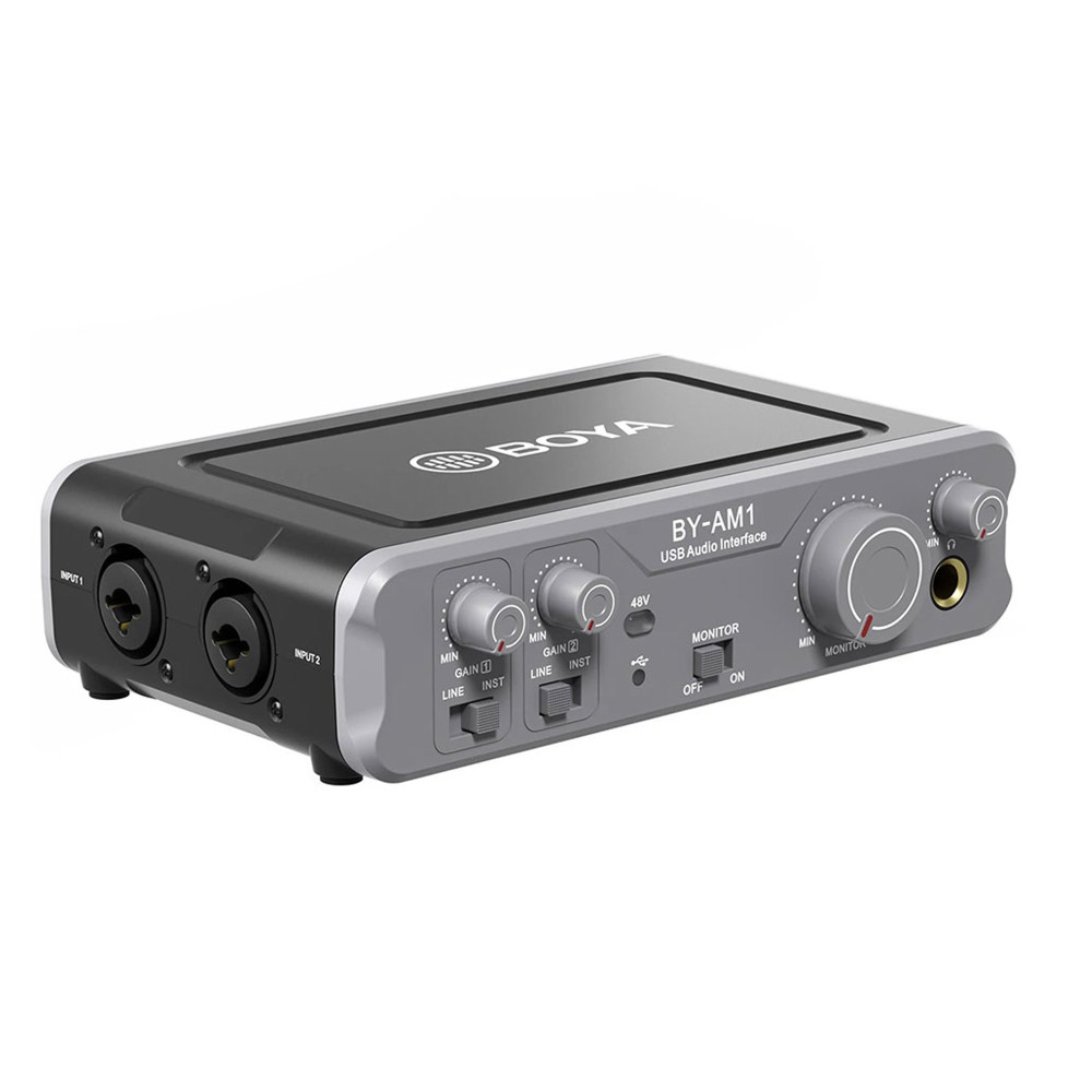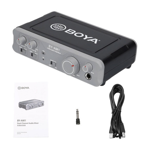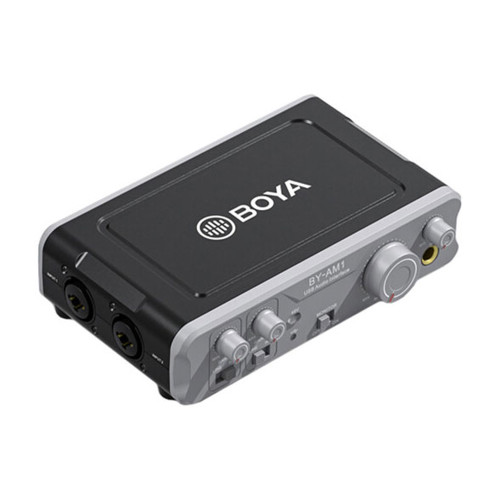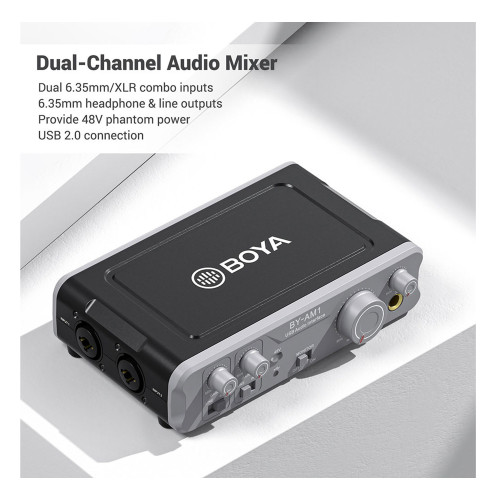 BY-AM1 میکسر صدای دو کاناله ساده است که یک گزینه مقرون به صرفه و جمع و جور اکسترنال را برای اتصال به دستگاه های line-In 6.35 میلیمتری و یا هر میکروفون XLR ( مانند بویا مدل M1000 یا بویا مدل BM58) در اختیار شما قرار می دهد و به شما امکان کنترل ورودی ها و انتقال سیگنال خروجی از طریق پورت USB 2.0 به رایانه را می دهد. به لطف ورودی های ترکیبی 6.35mm/XLR تعبیه شده، این کارت صدا می تواند به راحتی سیگنال را مستقیماً از میکروفون XLR یا سازهای الکتریکی مانند گیتار و غیره دریافت کند. هنگام اتصال به میکروفون XLR و سازهای الکتریکی، BY-AM1با توجه به نرخ نمونه برداری 44.1 الی 192 کیلوهرتز، کمترین افت صدا را ارائه می دهد. از آنجائیکه این دستگاه، دارای جک هدفون مانیتورینگ 3.5 میلیمتری و آداپتور صدای 6.35 میلی متری به 3.5 میلی متری است، این امکان برای شما فراهم است تا بتوانید سیگنال ورودی را از طریق هدفون و بدون هیچ گونه اکو مزاحم و یا تأخیری بشنوید. لازم بذکر است که کارت صدای BY-AM1 می تواند فانتوم پاور 48 ولتی را برای میکروفون های پسیو تأمین کند. همچنین این کارت صدا دارای پیچ رزوه دار 4/1 اینچی برای نصب بر روی سه پایه است.