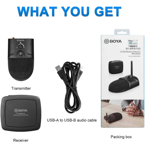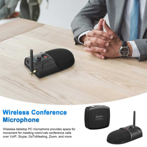 میکروفن وایرلس کنفرانس BOYA BY-BMW700 برای وقتهایی که شما شرایط استفاده از میکروفونهای با سیم رو ندارین و نمیخواین حین کنفرانس میکروفون کمتر توی دید باشه، کاربرد داره. میکروفون کنفرانسی بویا by-bmw700 یک فرستنده بیسیم سطحی داره که به راحتی میتونه روی میز کنفرانس یا میز کارتون قرار بگیره.