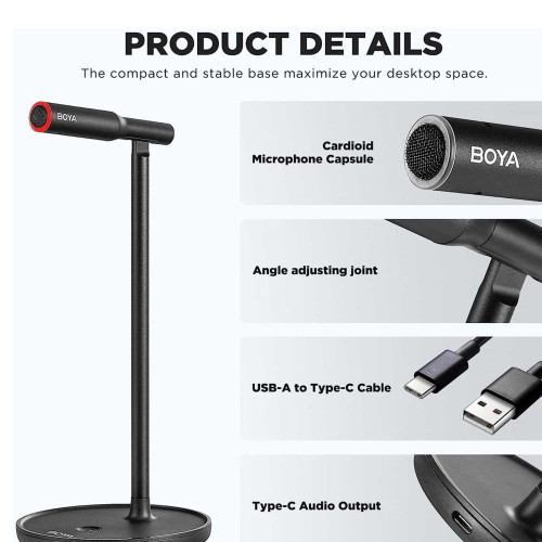 میکروفون استودیویی و رومیزی با سیم بویا مدل BY-CM1 یه محصول ساده و در عین حال کاربردیه که بیشتر برای کسایی که کارهای حرفهای نمیکنن مناسبه. خوبی که این مدل داره نیاز نداشتن به باتری هست و فقط کافیه که کابلش رو که رابط تایپ سی داره به دستگاههای مورد نظرتون وصل کنین. بویا تولید کننده این محصوله و سعی کرده برای ساخت میکروفون بهترین متریال و قابلیتها رو در نظر بگیره تا همه کاربرهای خودش رو راضی نگه داره.