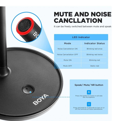 چیزای دیگه که روی بدنه میکروفون رومیزی بویا مدل BY-CM1 دیده میشه نشونگر LED و کلید قطع و وصل میکروفون هستن و میتونین زاویه و جهت اون رو هم خودتون تنظیم کنین.