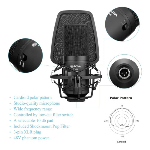 میکروفون استودیویی بویا مدل Boya BY-M800 یک میکروفون خازنی با دیافراگم بزرگه که برای کاربردهای ضبط صدا در استودیو طراحی شده. این میکروفون یک الگوی قطبی کاردیوئید داره که روی صدای منبع جلوی دیافراگم تمرکز میکنه و صداهای اطراف رو تا حدود زیادی فیلتر میکنه. پس شما میتونین از این میکروفون برای ضبط صداهای افراد یا ضبط صداهای ابزار موسیقی توی استودیو استفاده کنین.