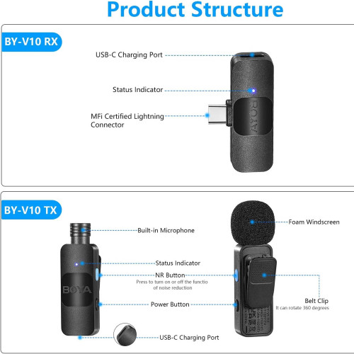میکروفون یقه ای بی سیم بویا مدل BY-V10 با رابط Type-C یه محصول تقریبا مشابه مدل V20 به حساب میاد که یه فرق مهم با اون داره؛ این تفاوت هم وجود یه فرستنده به جای دو فرستنده توی این مدله. بقیه مشخصات مثل کیفیت پخش و ضبط صدا، توی هر دو محصول کاملا یکسانه.
