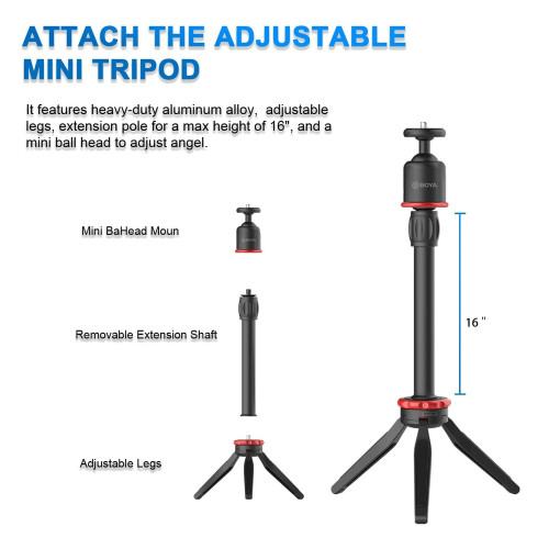 BY-VG330 یک کیت ویدئویی کامل برای تلفن هوشمنده که از یک میکروفون شاتگانی کندانسری BY-MM1، گیره نگهدارنده تلفن هوشمند، بال هد، لوله افزایش طول، سه پایه کوچک و گیره با پایه کفشکی تشکیل شده. طراحی سبک و جمع و جور این کیت BY-VG330 باعث شده که بتونین خیلی راحت از این مجموعه هم در فضای داخل و هم بیرون استفاده کنین. فوم بادگیر خزهای موجود در این کیت، باعث کاهش صدای باد در فضاهای باز میشه. این مجموعه یک سه پایه کوچک با قابلیت تنظیم داره و از آلیاژ آلومینیوم سنگین و مقاوم ساخته شده، یک میله برای افزایش ارتفاع تا 40 سانتیمتر و یک بال هد(سری توپی شکل) برای تنظیم کردن دوربین در بهترین زاویه توی این کیت قرار داره. گیره نگهدارنده گوشی هوشمند برای انواع مختلف از گوشیها مناسبه و با وصل کردن به بال هد و سه پایه، میشه بهصورت رومیزی ازش استفاده کرد. یک گیره با پایه کفشکی اضافی هم وجود داره که میتونین لوازم جانبی مختلفی مثل چراغ LED رو روش وصل کنین؛ اگه نیاز به رینگ لایت دارین پیشنهاد میکنم کیت ویدیویی بویا مدل BY-VG350 رو تهیه کنین.