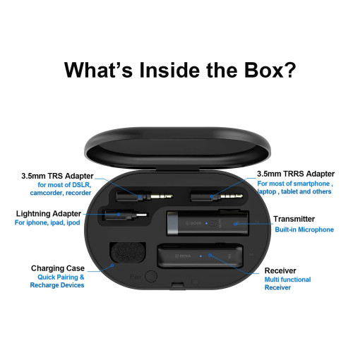 اقلام همراه میکروفون | دفترچه راهنما | ۱ عدد فرستنده | ۱ عدد گیرنده | ۱ عدد فیلتر نرم کننده صدا | ۱ عدد باکس شارژ | ۱ عدد رابط Lightning | ۱ عدد کابل Type-C برای شارژ | ۱ عدد خز بادگیر | 1 عدد رابط جک 3.5 میلی متری TRS (2خط) | 1 عدد رابط جک 3.5 میلی متری TRRS (3خط) |