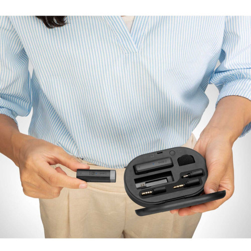 علاوه بر این، این میکروفون به باکس شارژدهی مجهزه، پس از استفاده از فرستنده و گیرنده و خالی شدن شارژشون، فقط کافیه دستگاهها رو برای شارژ دوباره تو باکس قرار بدین. خود باکس هم دارای باتری با ظرفیت 1000 میلی آمپره که میتونین اون رو از طریق رابط USB-C شارژ کنین. پس از هر بار شارژ، فرستنده تا 4.5 ساعت و گیرنده تا 8 ساعت میتونن واستون کار کنن. در ضمن نقش دیگه باکس شارژ، جفت کردن فرستنده و گیرنده با همه.