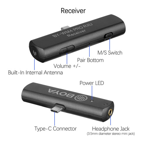 روی گیرنده میکروفون یقه ای بی سیم بویا مدل BY-WM4 PRO-K5 رابط Type-C دکمه میزان صدا، نشانگر LED، درگاه جک 2.5 میلیمتری، کانکتور تایپ سی دیده میشه و توی فرستنده هم دکمه روشن و خاموش، جایگاه مخصوص باتری و LED قرار گرفته.