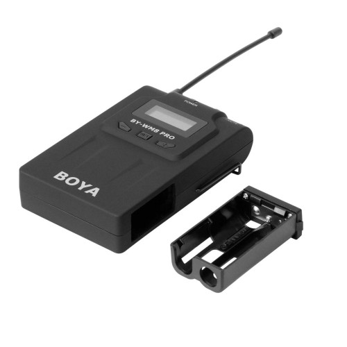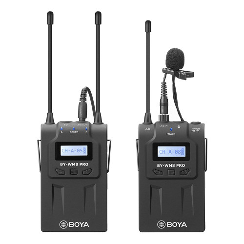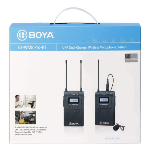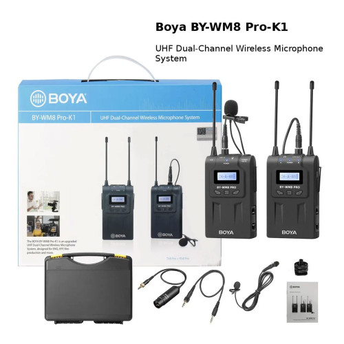 میکروفون بیسیم بویا مدل WM8 Pro K1 یک میکروفون UHF بیسیم است که از یک فرستنده و گیرنده تشکیل شده. گیرنده را میتوان به دوربین فیلم برداری، تلفن همراه و غیره متصل نمود. از میکروفون های (یقه ای) Lavalier به طور گسترده برای مصاحبه ها، ارائه، اجرای نمایش و ولاگها استفاده میشود. میکروفن و فرستنده به شخصی که جلوی دوربین است و گیرنده به دوربین فیلمبرداری یا ضبطکننده صدا متصل میشود. این میکروفون بیسیم برای تداخل کمتر و داشتن صدایی با کیفیت بالاتر از فرکانس UHF استفاده میکند. مدل WM8 Pro K1 در واقع ارتقا یافته میکروفونهای دوتایی بی سیم WM6 و WM8 است. به عنوان مثال، نسخه Pro نسبت به مدل معمولی دارای اعوجاج صوتی کمتری است؛ بنابراین صدا با کیفیت بهتری دریافت میشود. وزن این مجموعه نیز نسبت به مدل معمولی کمتر است.