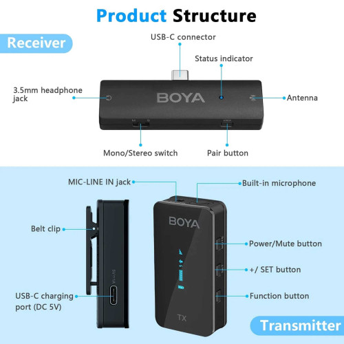 - میکروفون بویا BY-XM6-K6 به چه دستگاههایی وصل میشه؟ گیرنده این میکروفون، رابط تایپسی داره؛ پس با همه دوربینهای فیلمبرداری، کامپیوترها و لپتاپهای با سیستمعاملهای Windows و Mac و تمامی گوشیهای هوشمندی که درگاه تایپسی دارن، سازگاره.