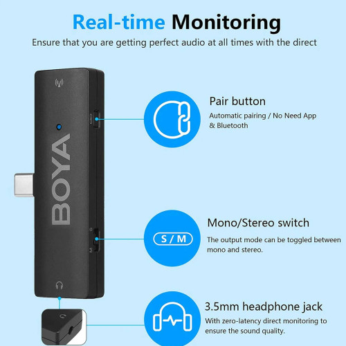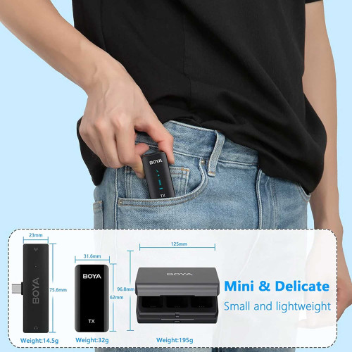 توی میکروفون بی سیم بویا مدل Boya BY-XM6 K6 فرستنده و گیرندهای قرار گرفتن که به ترتیب 35 و 16 گرم وزن دارن؛ ابعاد فرستنده اون هم 16.5×31.6×62.1 میلیمتره. روی این محصول یه کلید برای روشن و خاموش کردن وجود داره که میتونین در صورت نیاز ازش استفاده کنین. ضمن اینکه توی این مدل، امکان تنظیم حالت ضبط مونو یا استریو رو هم دارین.