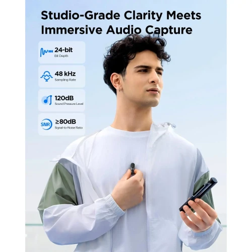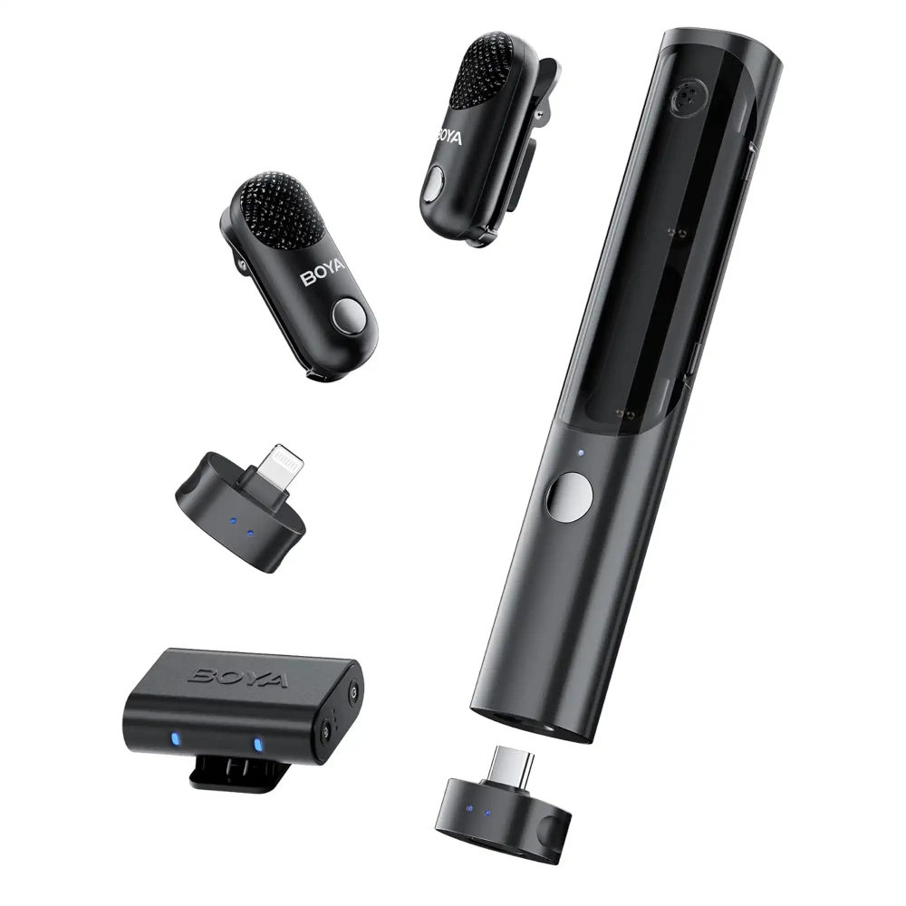 - 2 عدد فرستنده (میکروفون) و 3 عدد گیرنده Type-C و Lightning و جک 3.5 میلی متری