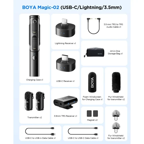 میکروفون یقه ای بی سیم دوکاربره بویا مدل BOYA MAGIC 02 رابط Type-C و Lightning و جک 3.5 میلی متری