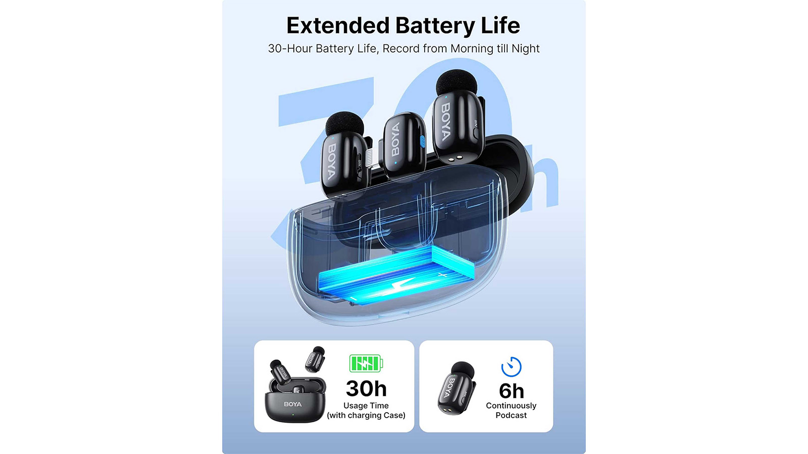 - شارژدهی 6 ساعته در حالت ضبط ( 30 ساعت با باکس شارژ )