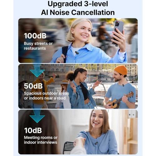 مشخصات فنی این میکروفون خیلی جذابه. ارتباطش بیسیمه و تا 100 متر برد داره که برای ضبط توی فضای باز یا استودیو کافیه. رابطش Lightning و Type-C هست، ولی این مدل بهخصوص با Lightning برای گوشیهای آیفون طراحی شده. فرکانس پاسخگویی بین 20 تا 20000 هرتزه و نسبت سیگنال به نویز (SNR) 80 دسیبله که کیفیت صدای شفافی میده. SPL تا 120 دسیبل رو تحمل میکنه و فیلتر نرمکنندگی صدا داره که نویز محیط رو کم میکنه. منبع تغذیهاش باکس شارژه؛ باتری لیتیوم-یون باکس 260 میلیآمپر ساعته و تکی 6 ساعت شارژدهی داره، ولی با باکس تا 30 ساعت کار میکنه. نشانگر LED هم داره که وضعیتش رو نشون میده، ولی درگاه هدفون برای مانیتورینگ نداره. نرخ نمونهبرداری 48KHz/16bit هم کیفیت صدای خوبی تضمین میکنه.