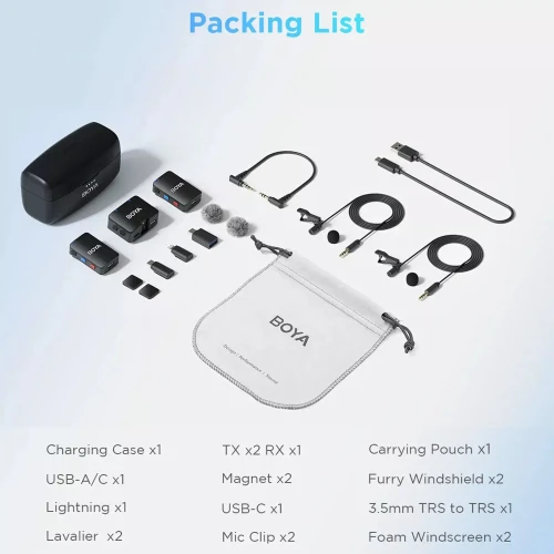 اقلام همراه میکروفون | ۱ عدد فرستنده | رابط جک ۳.۵ میلی متر به TRS | ۲ عدد خز بادگیر | ۱ عدد باکس شارژ | 1 عدد کابل Type-C | 1 عدد کیف پارچهای | 2 عدد میکروفون یقهای | 2 عدد میکروفون یقه ای باسیم | 2 عدد گیره | 2 عدد فیلتر نرم کنندگی صدا | 1 عدد تبدیل USB-A به USB-C | 2 عدد مگنت | 1 عدد کابل AUX |