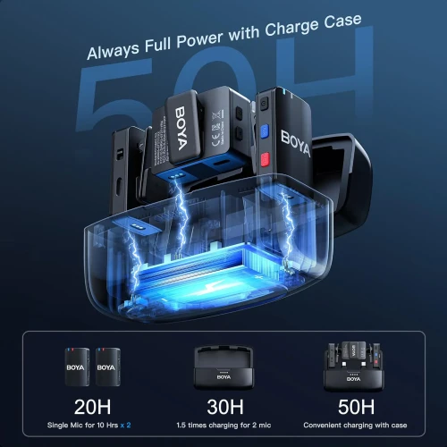 میکروفون BOYAMIC از باتری لیتیوم یون با ظرفیت 1800 میلیآمپر ساعتی استفاده میکنه و باکس شارژی که داره، به شما امکان میده که توی هر زمان و مکانی بتونین میکروفون رو شارژ کنین.