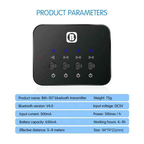 گیرنده و فرستنده صدا بلوتوثی مدل BW-107 دستگاهی دو کاره است که میتوان برای تمامی لوازم مانند تلویزیون، اسپیکر، هدفون تبلت و گوشیهای هوشمند و ... استفاده کرد. نخستین کار این دستگاه، ارسال صدا از پورت خروجی AUX تلویزیون، DVD، بلوری، MP3 پلیر، کارت صدای کامپیوتر و لپ تاپ و.. به صورت بیسیم به انواع هدفون، هدست و اسپیکر و سینمای خانگی بلوتوثی است و دومین امکان این دستگاه به صورت همزمان دریافت صدای بلوتوثی از انواع گوشی موبایل، تبلت اندروید و IOS و لپتاپ و تبدیل آن به یک خروجی صدا به صورت جک 3.5 میلیمتری ( AUX ) استریو است تا بتوان با آن موسیقی و صدا را با گوشی موبایل و تبلت روی انواع ضبط ماشین، اسپیکر و ... پخش کرد. فرستنده و گیرنده BW-107 با پشتیبانی از بلوتوث نسخه 4.2 تا برد 8 متر میتواند عملکرد بسیار خوبی از خود به نمایش بگذارد. پروتکلهای پشتیبانی شده سراسری گیرنده و فرستنده بلوتوث صدا BW-107 شامل مواردی مانند A2DP, AVRCP, HFP, SPP HID است و امکان ارتباط و دریافت و ارسال صدا از انواع کامپیوتر، لپتاپ، گوشی موبایل و اتصال به انواع هدفون و هدست بلوتوثی را فراهم مینماید. ورودی و خروجی این دستگاه شامل دو پورت AUX 3.5 میلی متری استریو است. یکی از این درگاهها ورودی صدا و دیگری خروجی صدا است. این دستگاه دارای امکان شارژ است. به این معنا که بدون نیاز به منبع تغذیه و با شارژ باتری درونی امکان کار دارد. یک باطری درونی 650 میلی آمپری لیتیوم - یون در درون این دستگاه وجود دارد که با استفاده از یک کابل USB شارژر معمولی که در درون بستهبندی کالا وجود دارد شارژ میشود. شما میتوانید آن را با هر پورت USB از جمله پورت USB یک شارژ موبایل و تبلت شارژ کنید و با یک بار شارژ شدن 2 ساعته این دستگاه تا 4 الی 5 ساعت از آن استفاده کنید. بهرهگیری از باتری درونی باعث شده این دستگاه پرتابل و قابل حمل ساده باشد.