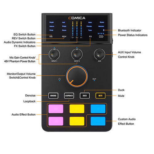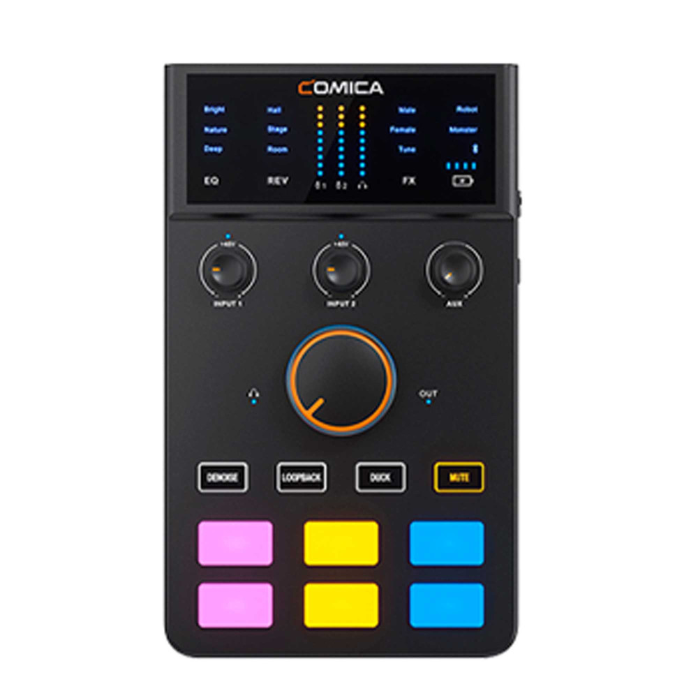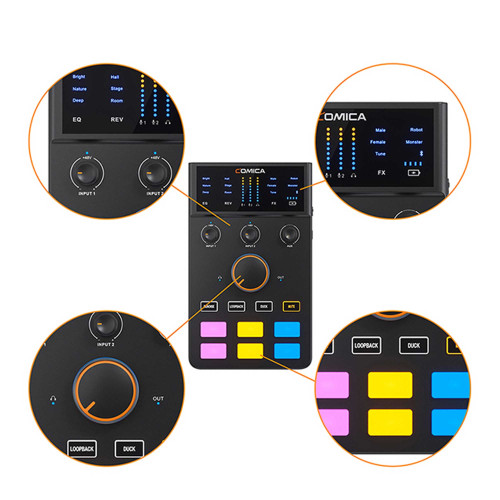 کارت صدای ADCASTER C1 ویژگیهای زیادی داره. اول از همه وجود صفحه نمایش HD با کلیدهای لمسیه، با این صفحه نمایش میتونین تنظیمات رو به راحتی انجام بدین. یه ویژگی دیگهش هم اینه که صدای محیط و نویز رو کاملا حذف میکنه. بنابراین میتونین برای ضبط کارهای حرفهای هم ازش استفاده کنین.