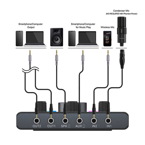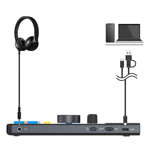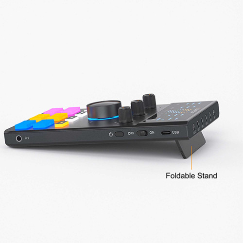 اگه به تصویر دقت کنین روی این مدل 5 تا کلید مختلف هم قرار گرفته که به صورت پیش فرض افکتهای صوتی جذابی رو ایجاد میکنن. برای شارژ کردن کارت صدا باید از ورودی تایپ سی استفاده کنین. به علاوه یه دونه هم ورودی برای مانیتوریگ کنار این درگاه تایپ سی دیده میشه. توی سمت دیگه کارت صدا 6 تا ورودی دیگه رو میبینیم که با اسمهای IN1، IN2، AUX، SPK، OUT1 و OUT2 مشخص شدن و هر کدوم برای اتصال به دستگاهی خاص در نظر گرفته شدن.