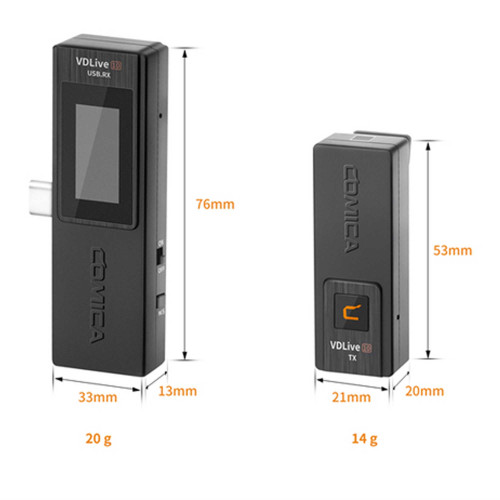 میکروفون یقهای بیسیم کامیکا مدل VDLive10 USB یک میکروفون بیسیم که برای استفاده یقهای با وزن بسیار سبک و به تفکیک وزن فرستنده 14 گرمی، باکس شارژ 167 گرمی و گیرنده 20 گرمی ساخته شده. ابعاد اجزای این میکروفون هم به ترتیب معادل باکس شارژ 37*96*99 میلیمتر، ابعاد گیرنده 13*33*76 میلیمتر و ابعاد فرستنده 20*21*53 میلیمتر هستش.