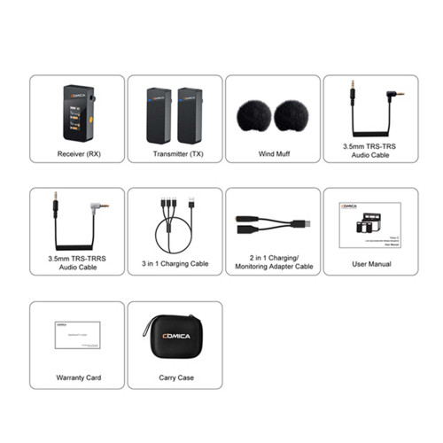 | اقلام همراه میکروفون | دفترچه راهنما | ۲ عدد فرستنده | ۱ عدد گیرنده | ۲ عدد خز بادگیر | 1 عدد تبدیل جک 3.5 میلی متری TRRS (3خط) به جک 3.5 میلی متری TRS (2خط) | 1 عدد کابل جک 3.5 میلی متری TRS به جک 3.5 میلی متری TRS دو سر | 1عدد کیف حمل و نقل | کابل شارژ سه شاخه | کابل تبدیل مانیتورینگ |
