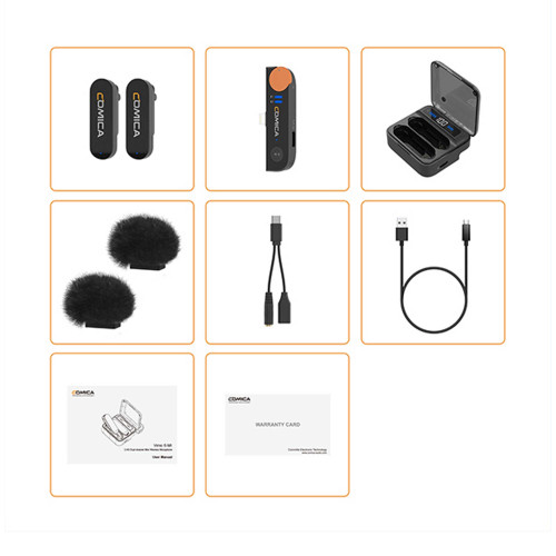- همراه با میکروفون VIMO S-MI، چه اقلام دیگهای دریافت میکنیم؟ توی بستهبندی این محصول باکس شارژ، خز بادگیر، گیرنده، فرستنده و کابل Type-C هم قرار داده شده.