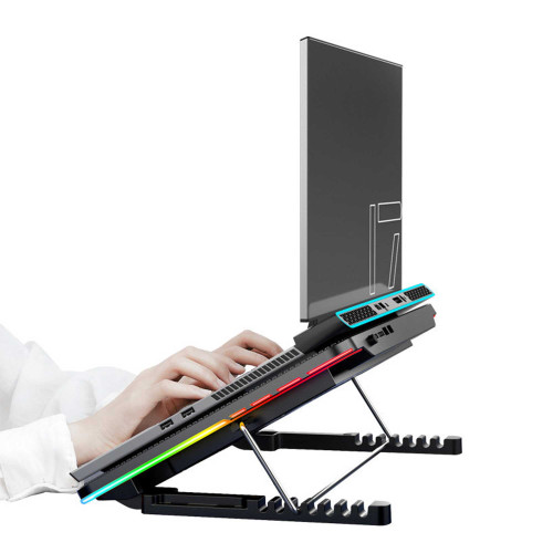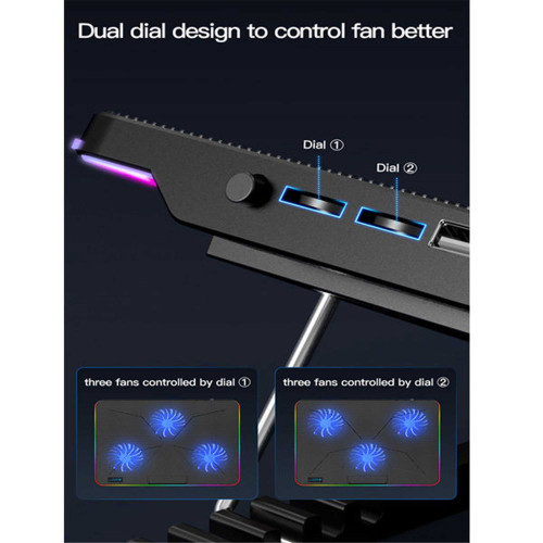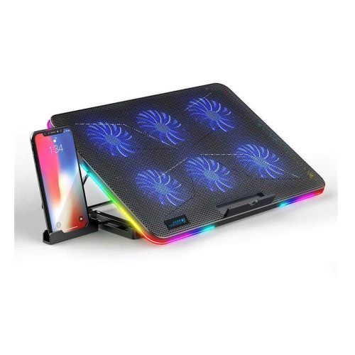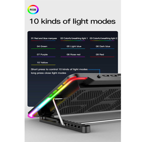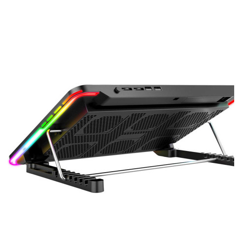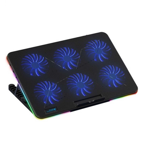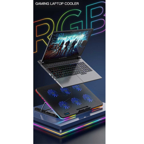 پایه خنک کننده لپتاپ کول کولد مدل F5 RGB از طریق یک کابل USB به درگاه USB لپتاپ شما متصل میشه و دارای نور پس زمینه RGB هم هست. این پایه دارای ۶ بوده که در ۷ حالت مختلف قابلیت تنظیم ارتفاع داره. این محصول برای لپتاپهای با نهایت سایز ۱۵.۶ اینچ طراحی شده.