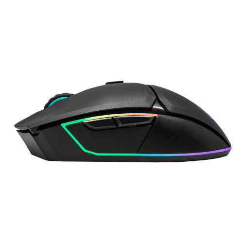 ماوس گیمینگ بی سیم کولرمستر MM831 یک ماوس بیسیم هست و از طریق پورت USB، بلوتوث و دانگل بیسیم میتونین از اون استفاده کنین. این ماوس از نسخه بلوتوث ورژن 4.2 بهره برده و DPI قابل تنظیم 32000, 16000, 4000, 1200, 400 رو داره که با سرعت IPS 400 و حداکثر شتاب G 40 و حسگر اپتیکال مجهز به سنسور PIXART PAW 3335 برای شما یک تجربه شگفت انگیز رقم بزنه. این محصول با حداکثر ضربه پذیری 20 میلیون کلیک و حداکثر پولینگ ریت 1000 هرتزی یک ماوس مطمئن برای انتخاب خواهد بود. همچنین به عنوان یک ماوس بیسیم گیمینگ این محصول هم دارای نورپردازی قابل تنظیم 16 میلیون رنگ از طریق نرم افزار اختصاصی خواهد بود و از قابلیت POWER SAVING هم بهرهمنده. این ماوس مجهز به باتری 800 میلیآمپر لیتیوم-یون هستش.