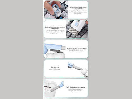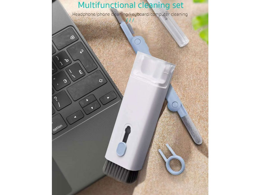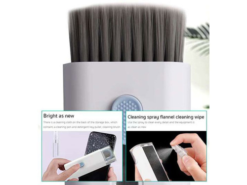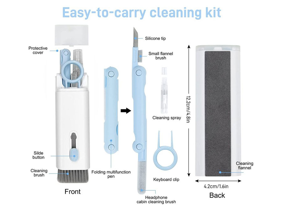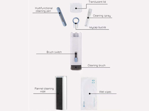 اقلام موجود در بستهبندی | قلم دارای سه سری سیلیکونی، ابزار نظافت صفحه کلید، برس متصل به جعبه، دستمال و اسپری |