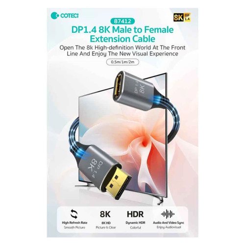 | سایر ویژگیها | جنس PVS+مش بافته شده+ روکش طلا، جنس هسته مس بدون اکسیژن (OFC)، رزولوشن ۸K@۶۰Hz و ۴K@۱۴۴Hz، اتصال کامپیوتر به تلویزیون یا مانیتور، اتصال کنسول بازی به تلویزیون یا مانیتور، منبع تصویر 8K و 4K، فناوری ۳D |